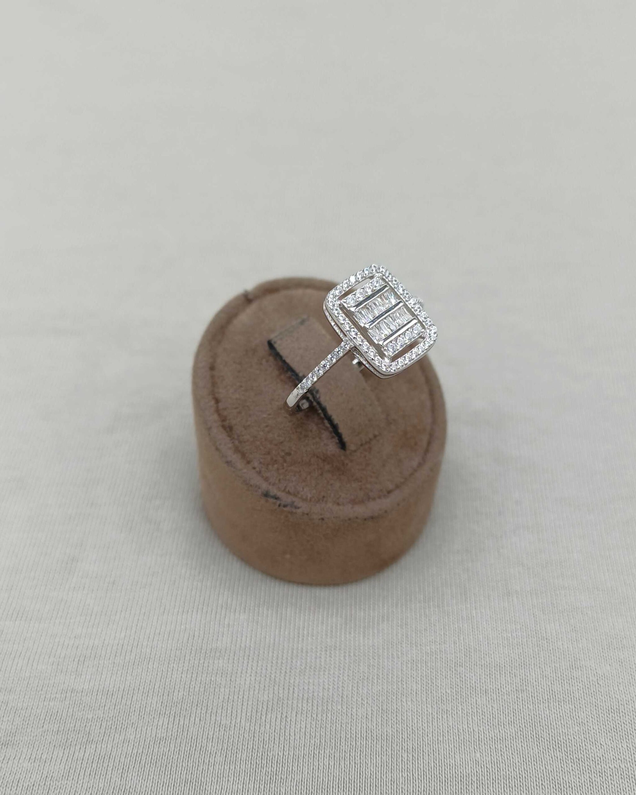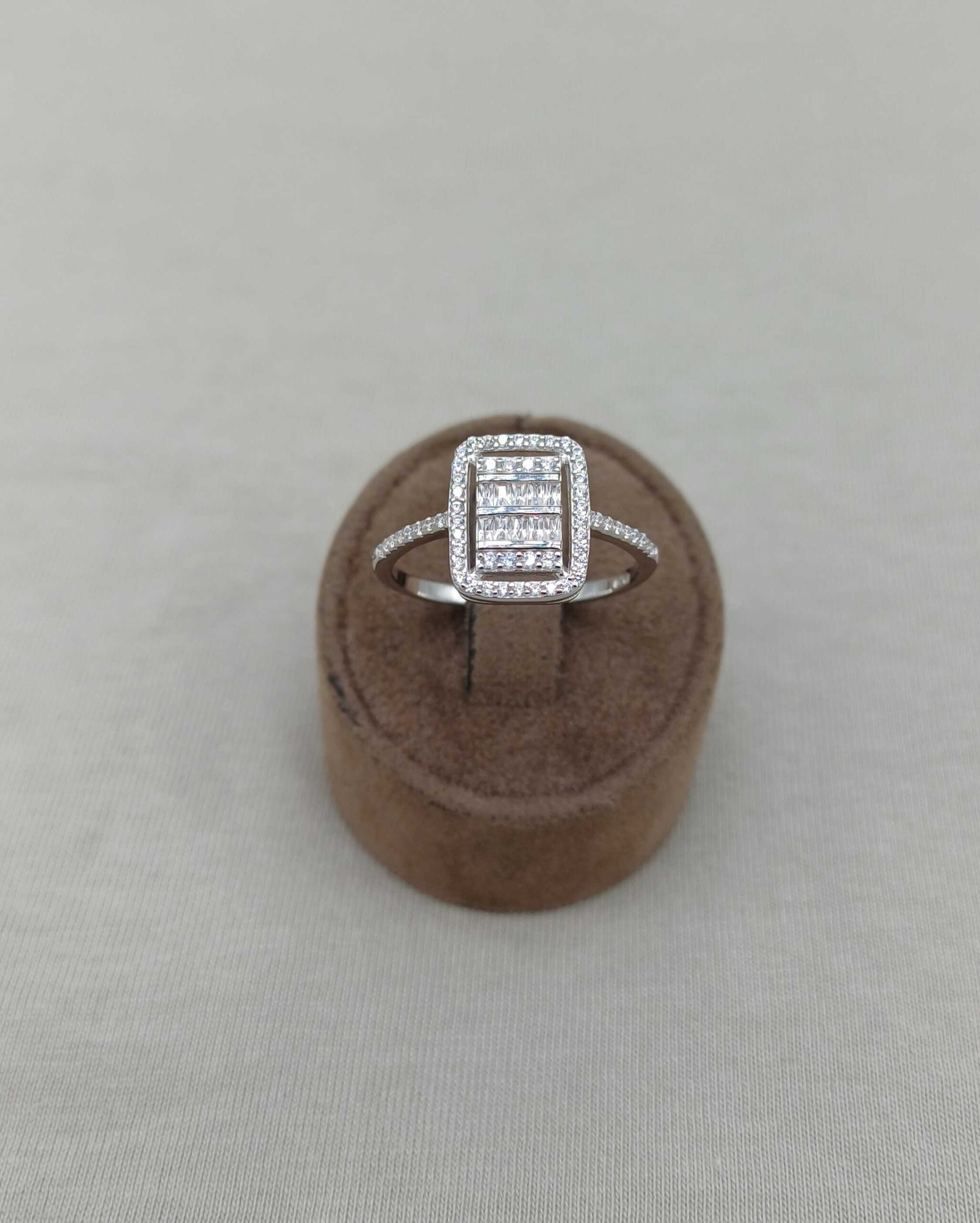 Geometrik zarafeti parmağınıza taşıyan bu kare taşlı gümüş yüzük, sade ama çarpıcı tarzıyla dikkat çeker.